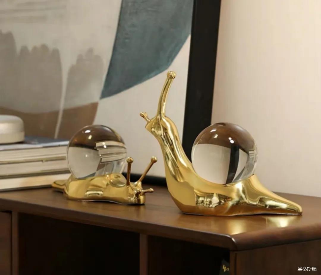 在黄铜材质上勾勒出蜗牛流畅的肌肉线条,描摹蜗牛攀爬蠕动与站立眺望的姿态,加上触须伸缩,丰富而逼真的细节制作,生动有趣。